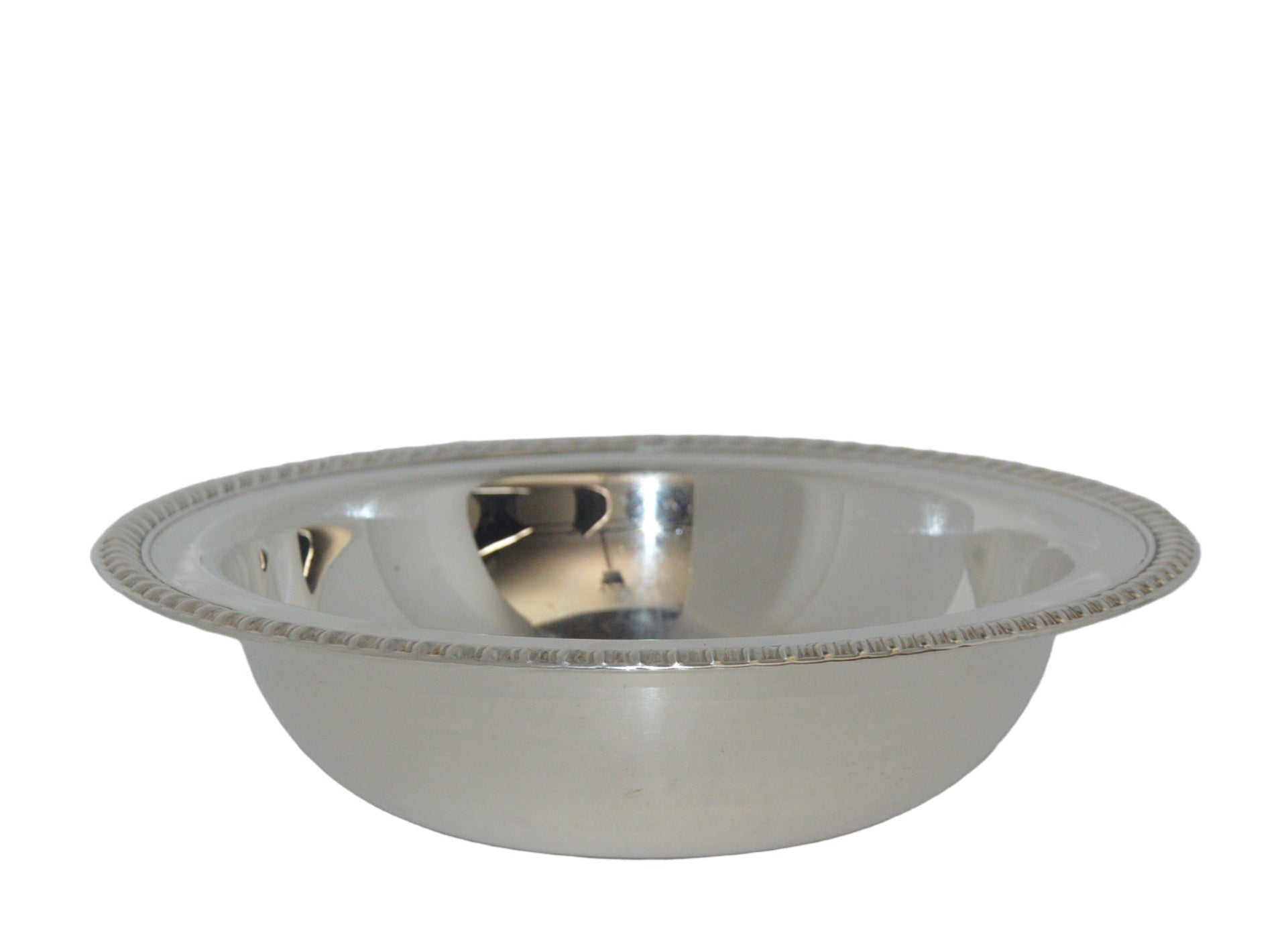 Elevate your serving experience with this vintage round silver-plated bowl by W. M. Rogers, featuring a distinctive rope top design. Measuring 10 1/2" wide by 2 1/2" deep, it offers ample space for stylish presentations.