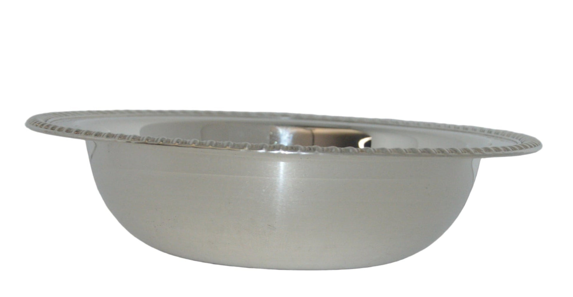 Vintage round silver plated serving bowl with rope top by W. M. Rogers #862 measures 10 1/2" wide x 2 1/2" deep