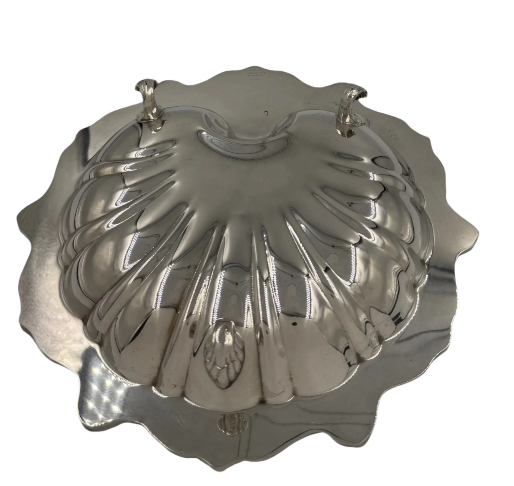 This elegant vintage serving bowl by Poole, crafted in silverplate EPCA, measures 11 1/2 by 11 inches with a depth of 2 1/4 inches.