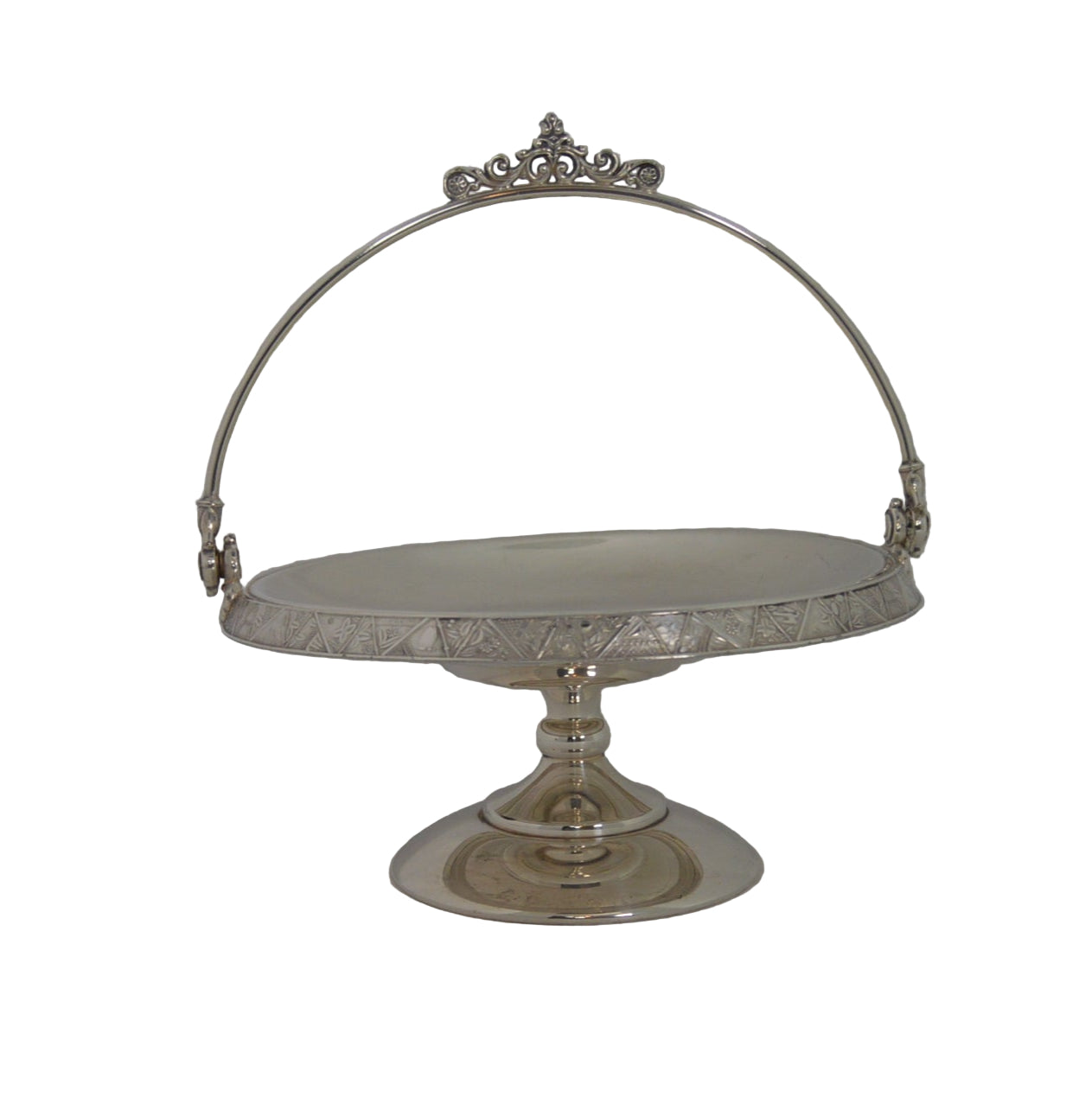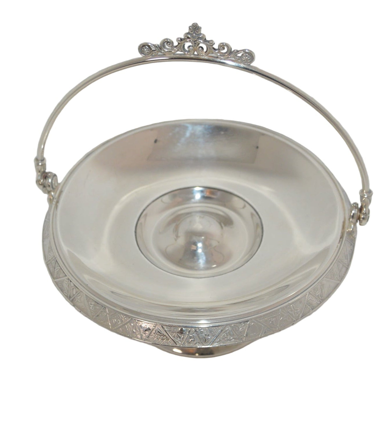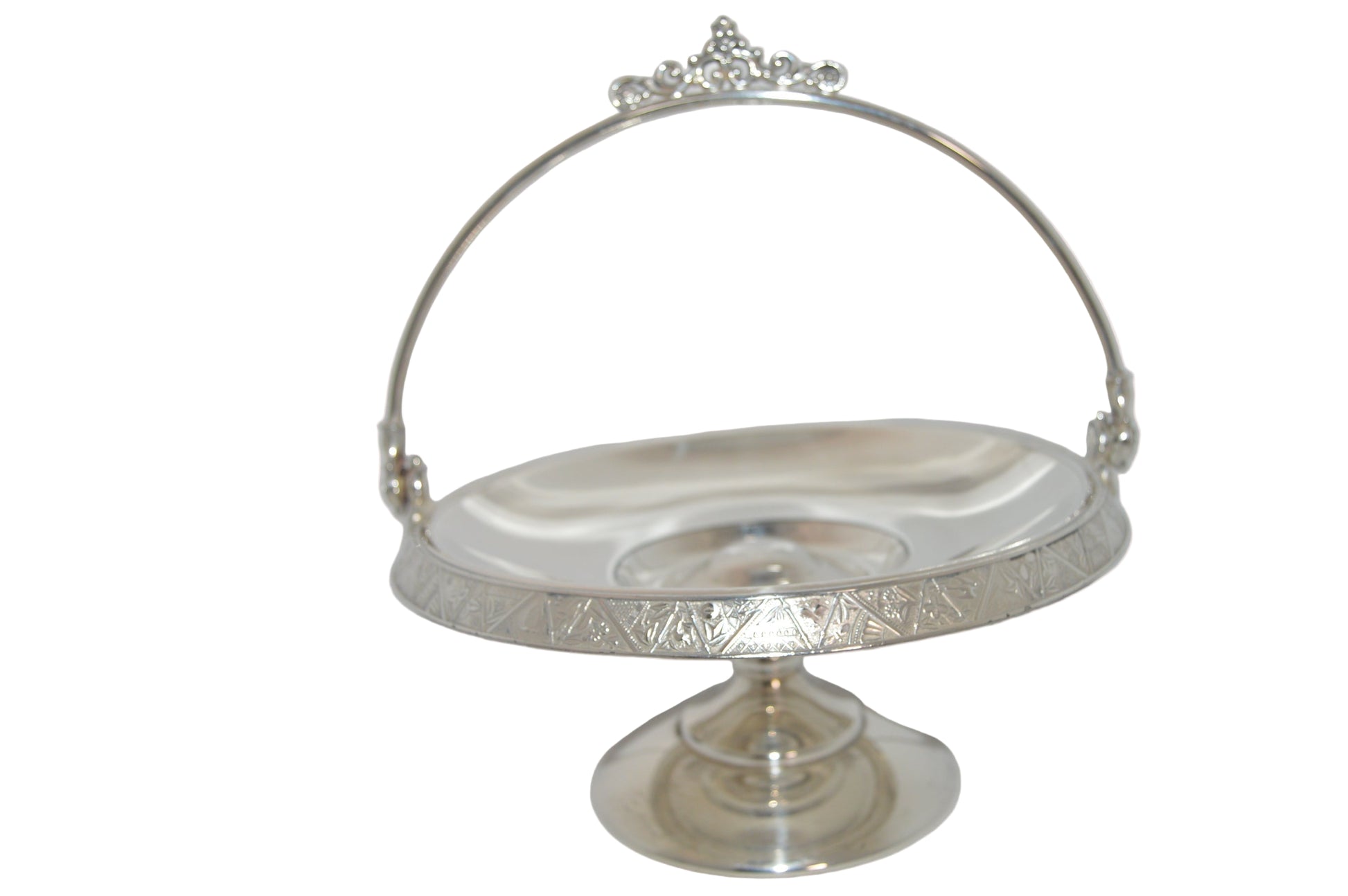 Vintage silver-plated candy dish early 1900's with handle and on pastel.