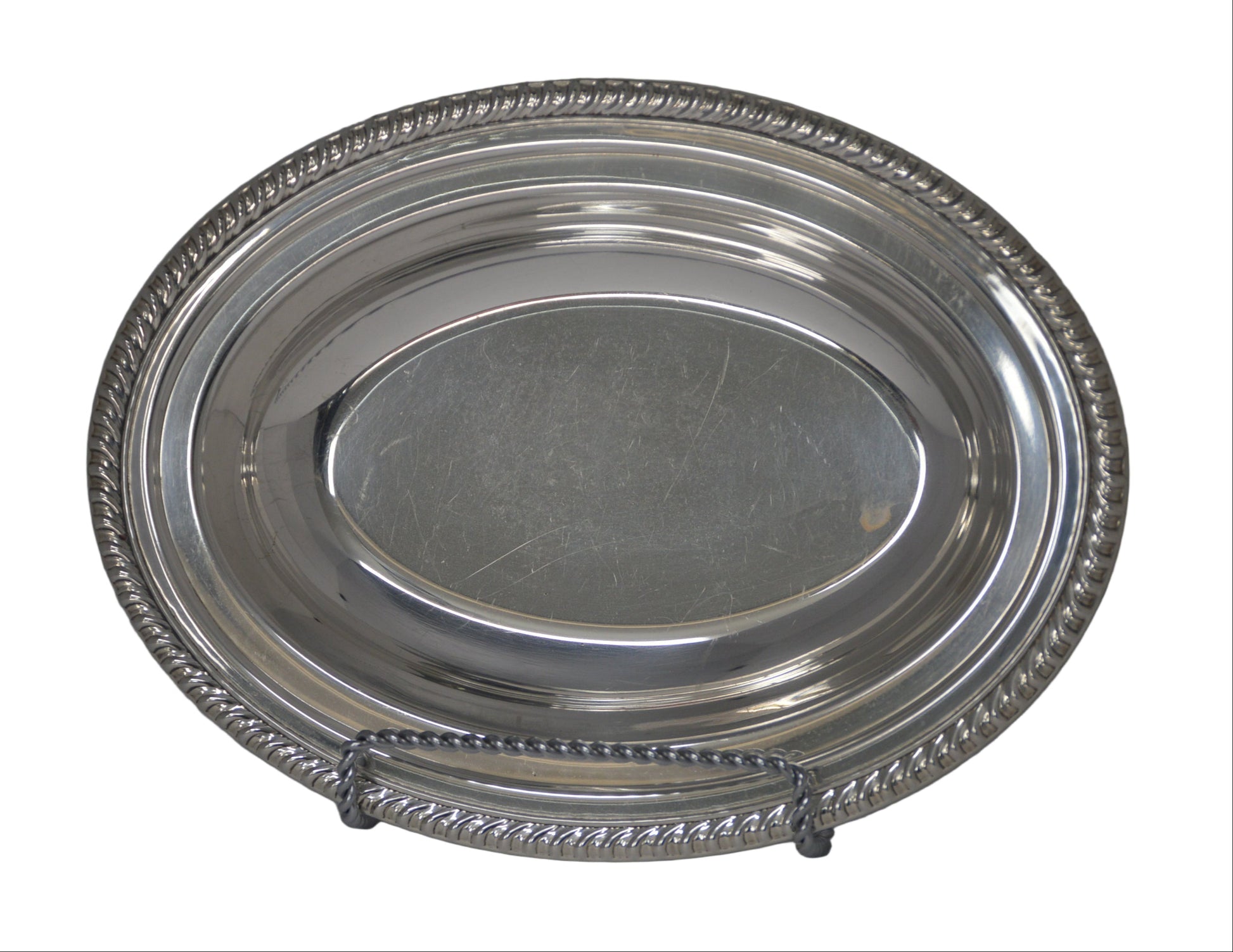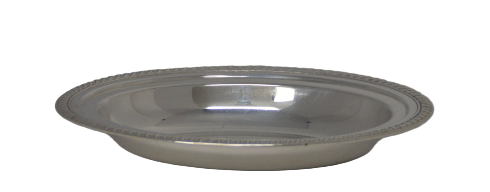 Add a touch of timeless elegance to your table with this vintage silver-plated rope-style edge serving dish by W. M. Rogers. Measuring 9" by 12" with a 1 3/4" depth, it provides generous space for serving your favorite meals with style.