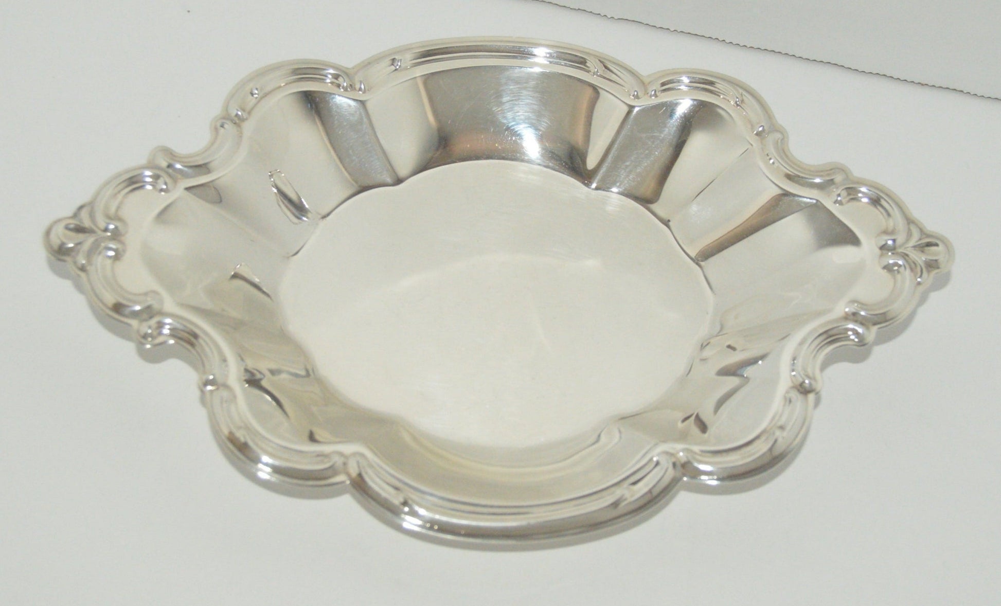 This charming vintage candy dish from the International Silver Company dates back to the 1950s and features elegant silver plating that adds a timeless touch to any setting. Measuring 9 1/4 inches long by 6 inches wide and 3/4 inch deep, it offers a perfect size for serving sweets or small treats.